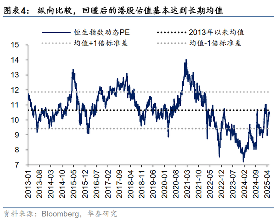 纵向比较,回暖后的港股估值接近长期均值。在2020年前,恒指动态PE稳定在10倍左右,过去有明显的均值回归特征。2021年至2024年初,港股估值持续趋势下探,最低达到7倍左右。2024年见到拐点,恒指估值企稳反弹至今,基本修复至历史均值水平。