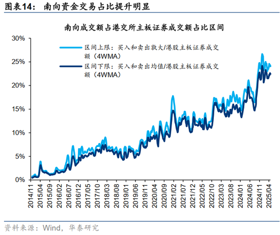 往后看,无论是南向资金还是外资,都有进一步流入港股的空间。对外资来说,其主要跟踪的 MSCI中国指数中,截止2025年5月22日港股权重已经超过80%。按MSCI全球可投资性指数纳入成分股规则,若港股股份年交易量连续12个月占比超过30%,MSCI会将成分股从ADR更改为港股,目前绝大多数股份均已从ADR转换为港股。这能够促成港股交易量上升,MSCI指数权重上升,被动资金更多投资港股的正循环。