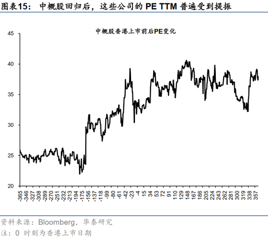 2)当下科技消费产业市值已经占到港股的半壁江山,港股不是过去的港股,业绩增长性会重塑港股的估值框架。给出高估值的前提是股票具有成长性,这一点现在的港股已经开始具备。往后看,中概股潜在继续回流趋势和更多科技公司上市或能进一步增加港股的成长属性。以阿里、京东、百度、网易等22家港美两地上市的代表性公司为例,在回流港股后,这些ADR的中位数PE TTM从上市前一年平均27.8倍提升到回港上市后一年的36.6倍。中概股回归,不仅有来自美国的推力,更有来自香港市场的拉力。