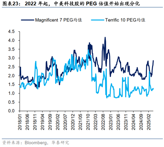 其次,新经济公司依然是内资和外资配置香港市场的核心,其相对美股成长性的改善或重塑港股估值模式。不仅是两地上市公司的H股估值低于A股,对成长性更高的港股稀缺标的来说,头部互联网企业(腾讯、阿里等Terr10)与美股相比也有差距。目前港股头部科技企业前向3年彭博一致PEG预期均值为1.09,对比美股Mag7的2.14显著低估。我们依然看好港股大权重科技和消费行业的趋势性机会。