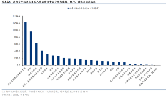 亿港币,对港股市场行情起到了重要的助推作用,香港市场已成为内地投资者配置不可缺少的一环。南向流入偏好或与外资配置偏好形成逻辑共振,今年以来南向主要流入非必需消费品分销和零售、银行、媒体与娱乐等板块。