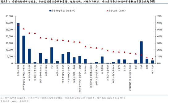 从资金配置效应方面看,在人民币向下空间或受限、向上空间打开的大背景下,外资此时流入港股不仅能获得来自权益市场股息及资本利得的收益,同样可以享受汇率变化带来的权益。我们以国际中介口径代替外资持股观察外资偏好的港股方向。以持有金额计,外资偏好媒体与娱乐、非必需消费品分销和零售、银行、保险等港股特色板块,其中对媒体与娱乐、非必需消费品分销和零售板块市值占比超50%(截至5月19日),具有一定定价权。若本次外资系统性流入港股,则对应方向或优先受益。