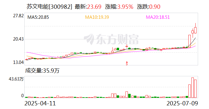 7月9日,苏文电能(300982)发布公告,公司股票在2025年7月7日、8日和9日连续3个交易日,收盘价格涨幅偏离值累计超过30%。